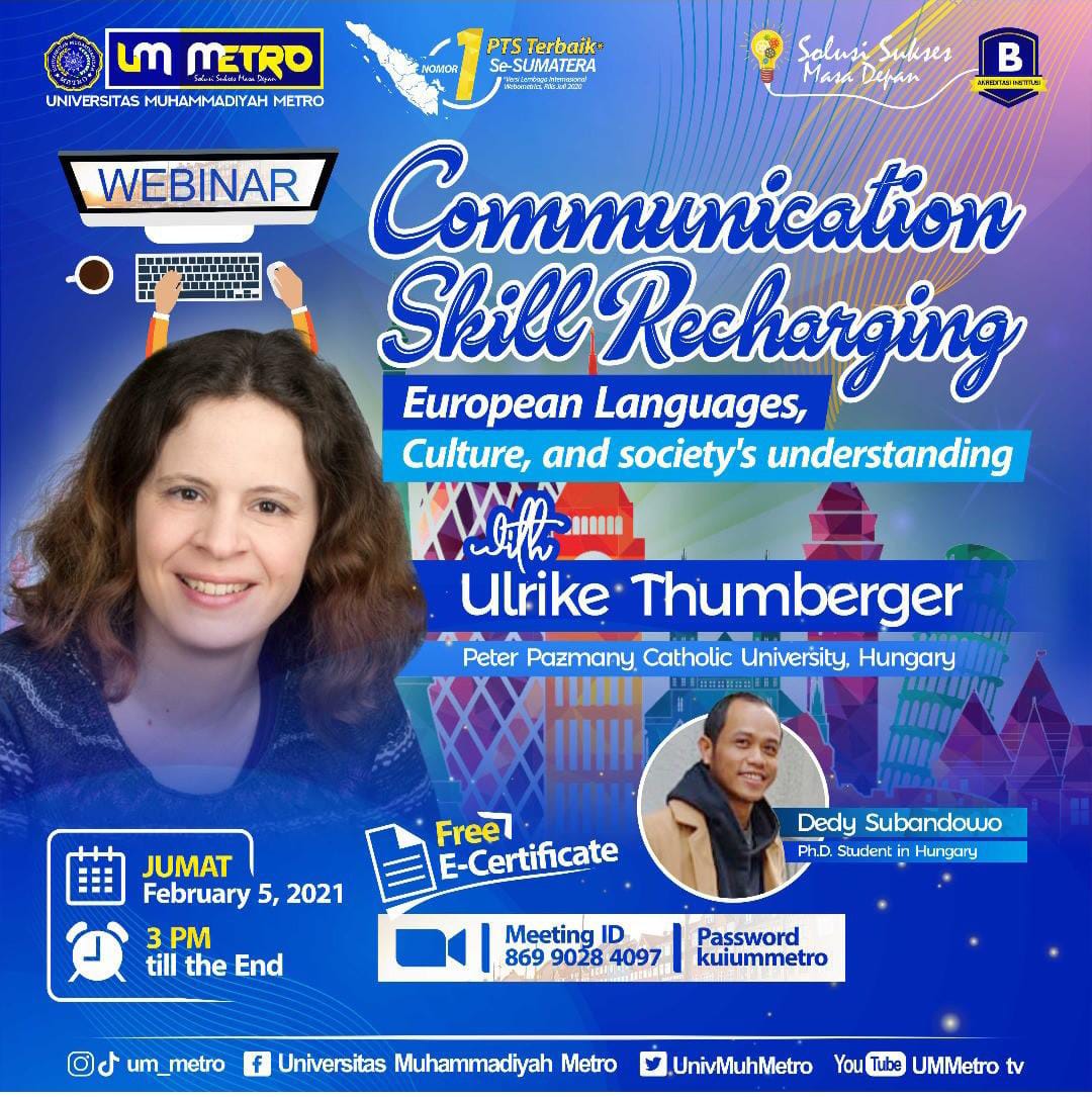 Universitas Muhammadiyah Metro, 5 Februari 2021 – Program Studi Pendidikan Bahasa Inggris Universitas Muhammadiyah Metro sukses menggelar webinar dengan tema "Communication Skill Recharging, European Language, Culture, and Society's Understanding". Webinar ini menghadirkan narasumber Ulrike Thumberger dari Peter Pazmany, Catholic University, Hungary.
