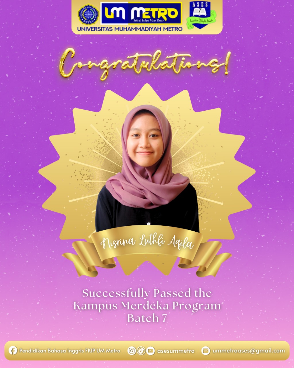 Nisrina Luthfi Aqila, mahasiswi semester 3 dari Program Pendidikan Bahasa Inggris Universitas Muhammadiyah Metro (UM Metro), telah berhasil lolos sebagai peserta Program Kampus Mengajar Angkatan 7.