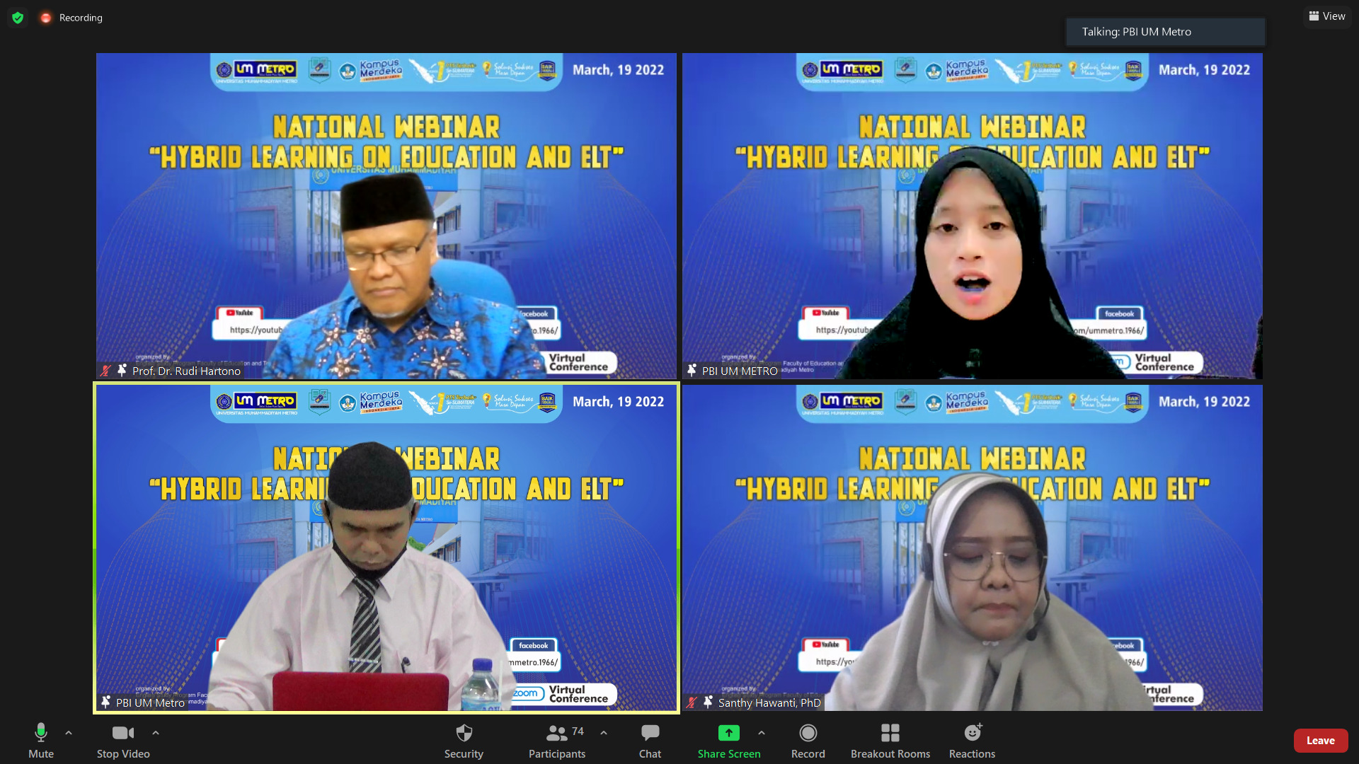 UM Metro – Program Studi (Prodi) Pendidikan Bahasa Inggris (PBI) Universitas Muhammadiyah (UM) Metro gelar webinar nasional dengan menukil tema “Hybrid Learning on Education and ELT,” Sabtu (19/03/2022).
