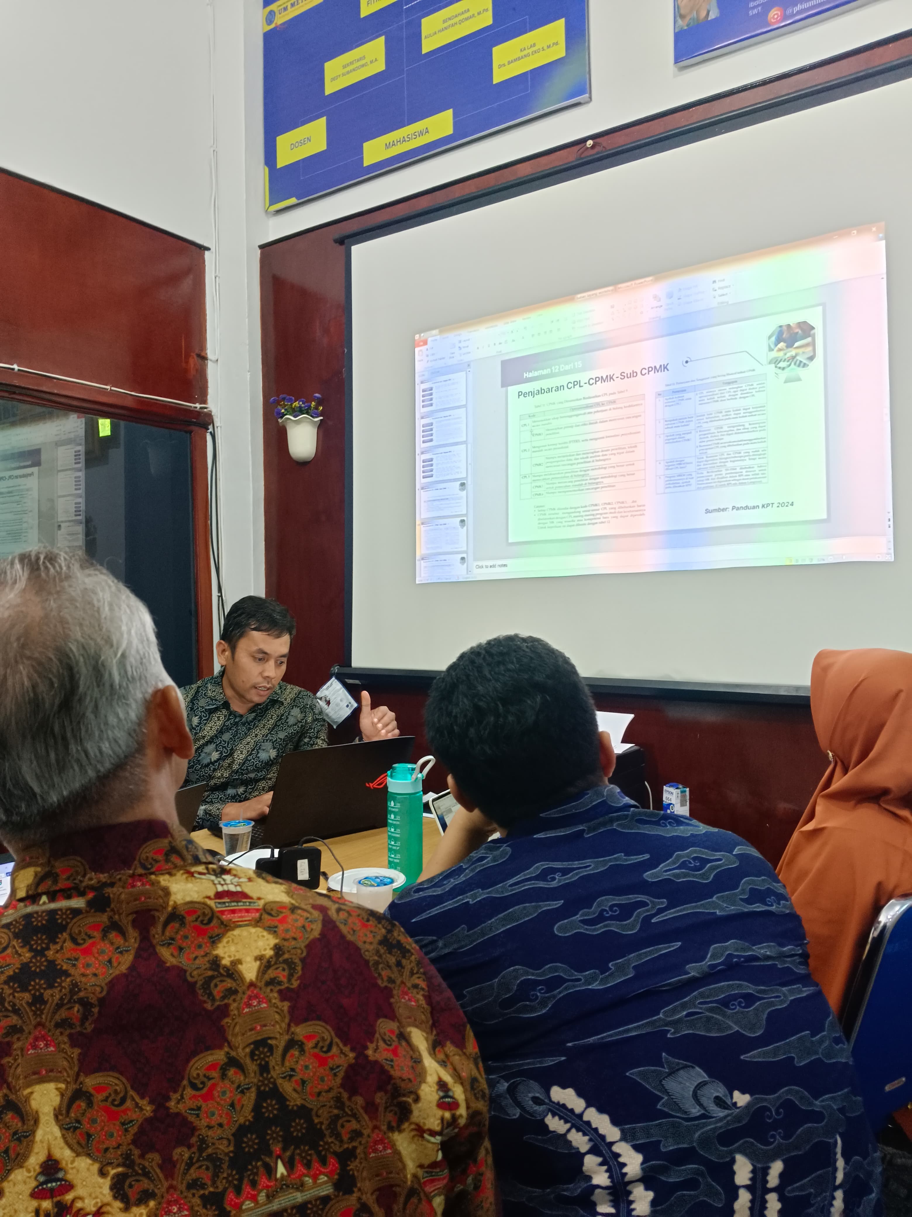 Workshop ini diadakan dengan tujuan untuk meningkatkan pemahaman dan keterampilan para dosen dalam menyusun RPS berbasis OBE. Dalam presentasinya, Bapak Riswanto menekankan pentingnya RPS yang berbasis pada Capaian Pembelajaran Lulusan (CPL) dan Capaian Pembelajaran Mata Kuliah (CPMK), serta sub CPMK, yang dirancang untuk memastikan ketercapaian hasil belajar mahasiswa sesuai dengan standar OBE.